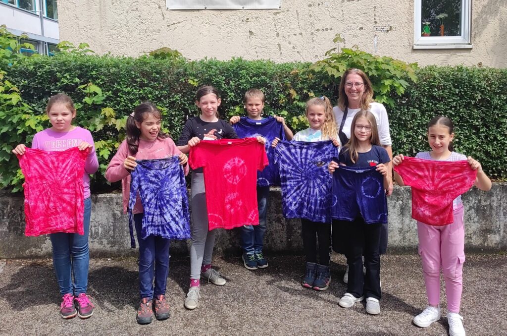 Die Kinder hatten die Möglichkeit T-Shirts, Unterhemden, Strümpfe usw. zu batiken. Als erstes mussten mehrere Verknotungen an den Kleidungsstücken angebracht werden, hierbei wurden verschiedene Techniken angewandt. Dann wurden die Stücke in das gewünschte Farbbad gegeben. Währenddessen wurde gevespert und gespielt. Nach ca. einer Stunde konnte man sie wieder herausholen. Danach mussten die Stoffe noch eine viertel Stunde im Fixierbad eingetaucht werden. Endlich konnten dann die Kinder ganz begeistert ihre kunstvollen und einzigartigen Kleidungsstücke bewundern und mit nach Hause nehmen.